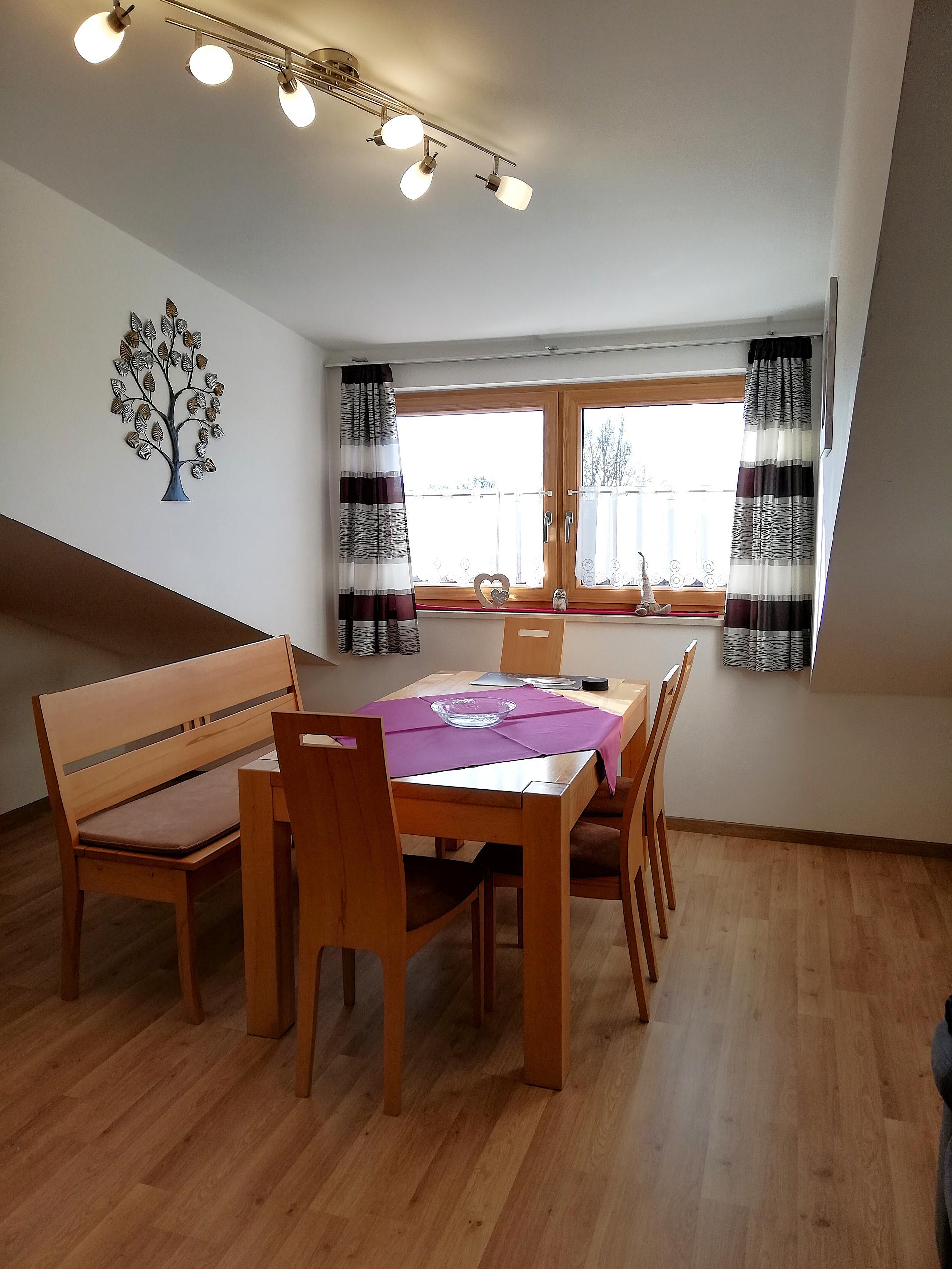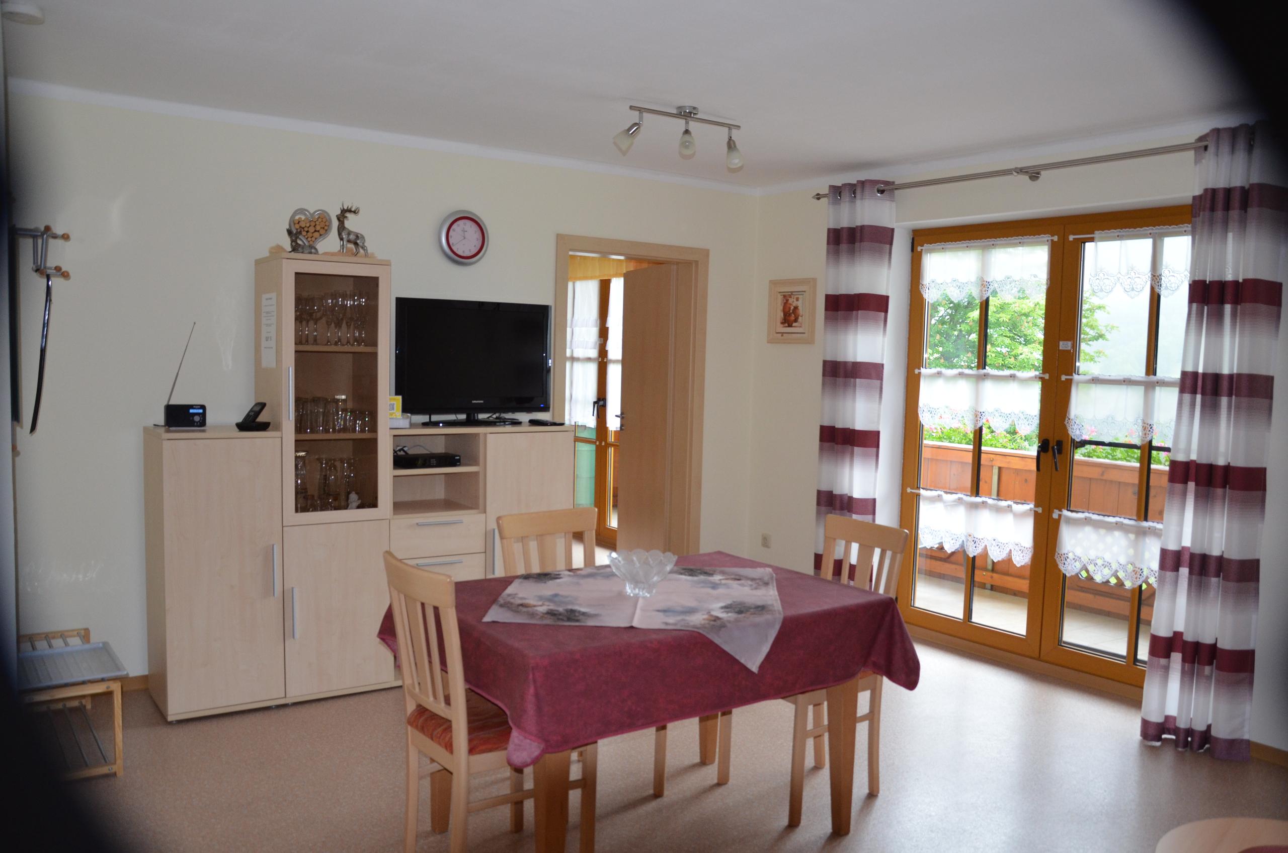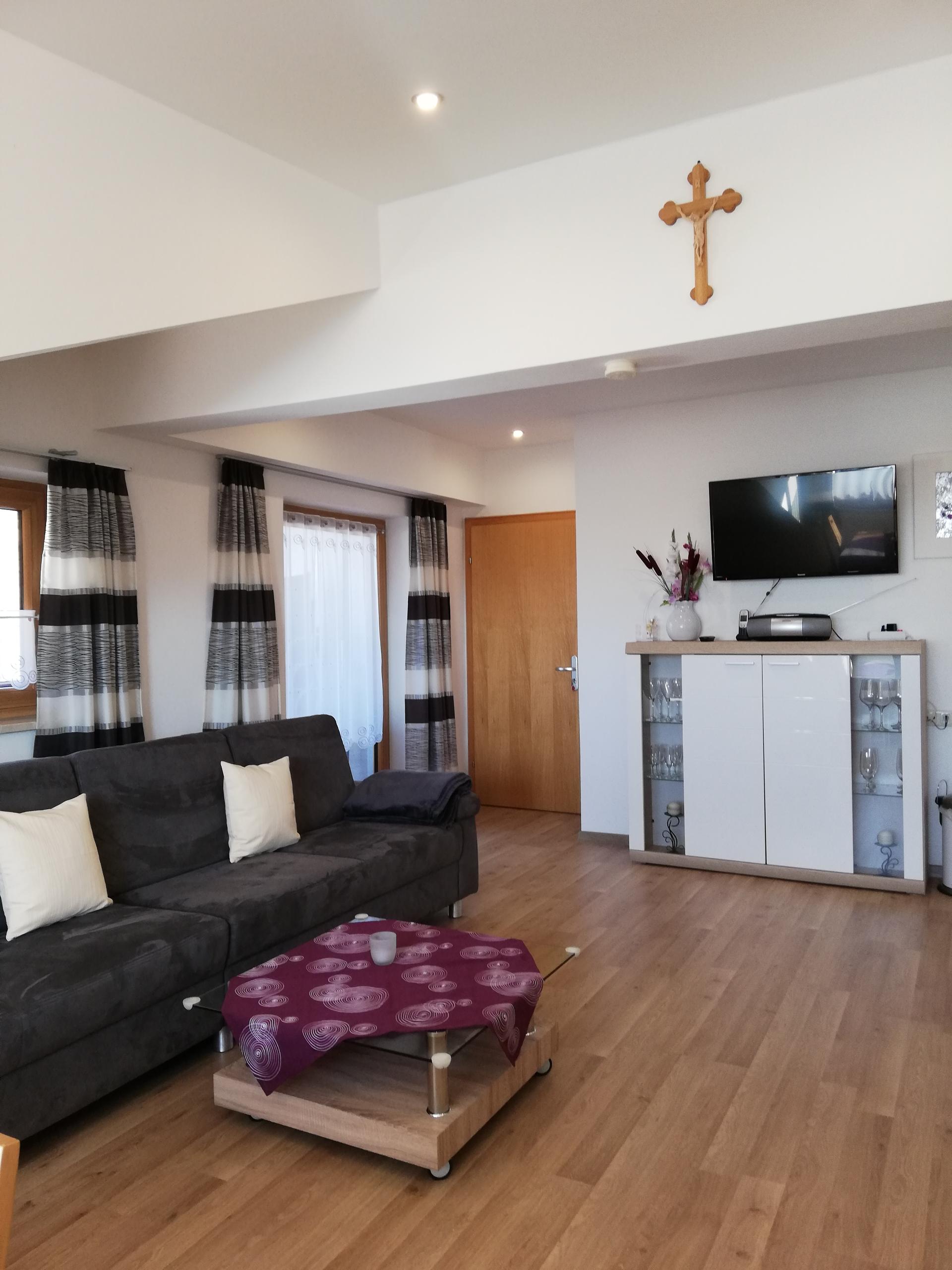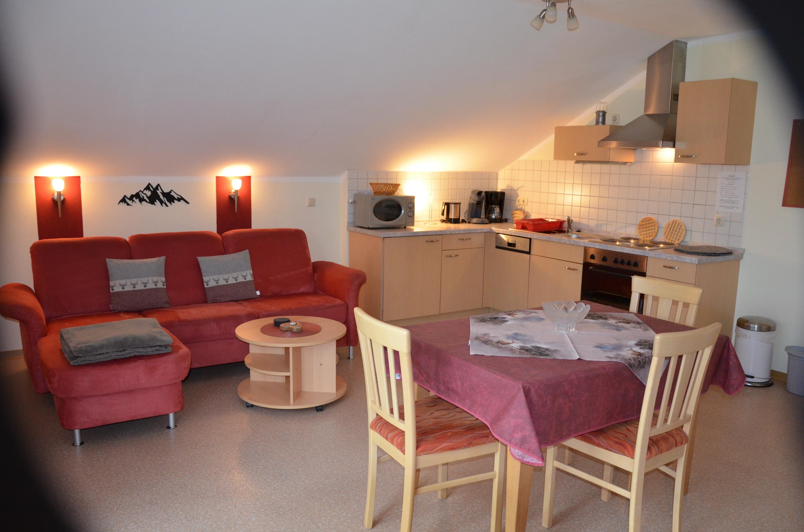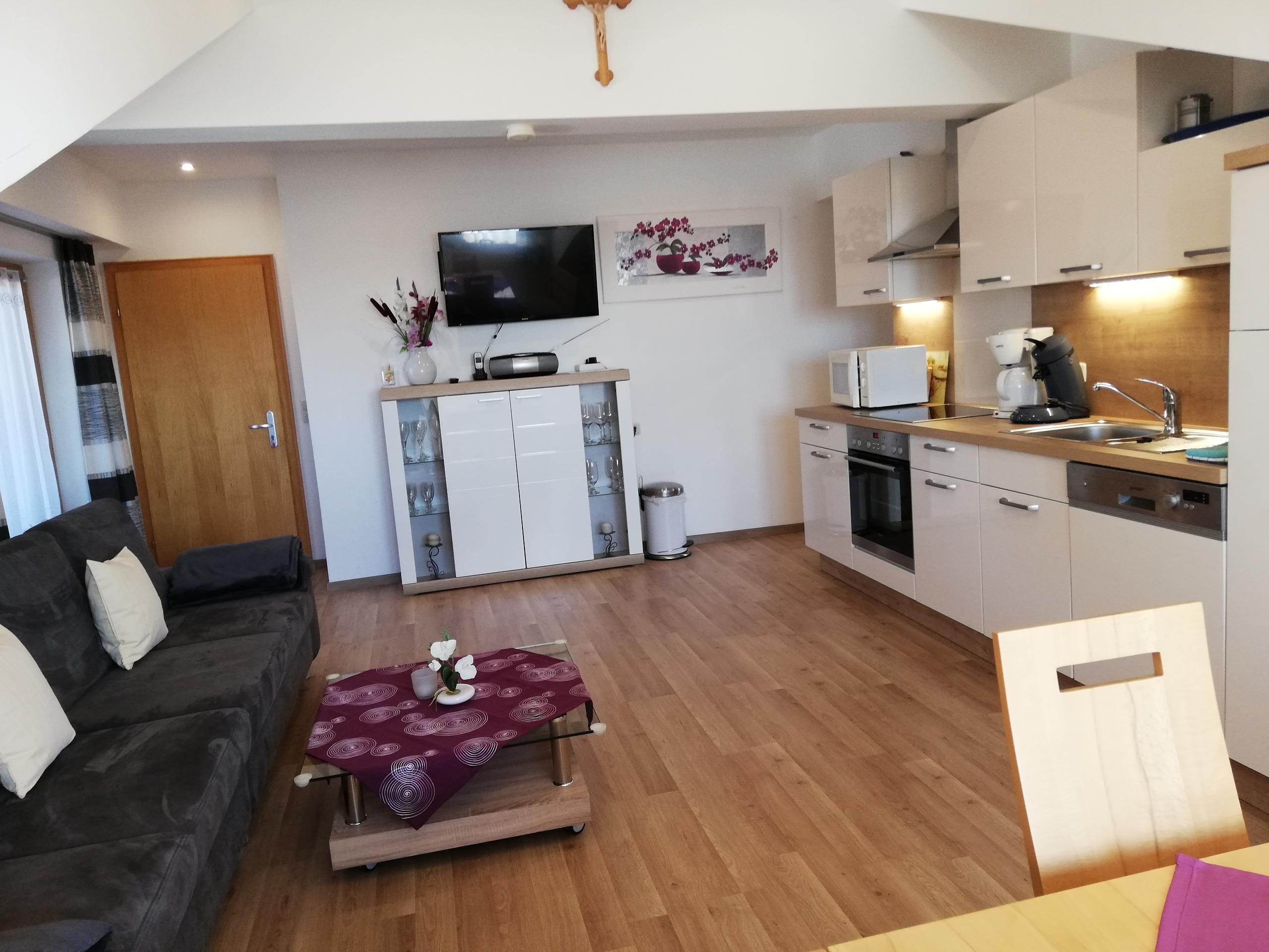 Unsere helle und gemütliche Ferienwohnung 2 bietet Platz für 2-3 Personen. Es ist möglich mit einem Zustellbett (90x200) zu erweitern.Das Bett kann sowohl im Wohnraum als auch im Schlafzimmer aufgestellt werden. Auch ein Kinderbett kann gestellt werden. Die Wohnung ist mit einer komplett eingerichteter Küchenzeile mit Spülmaschiene, Mikrowelle, Herd mit Backofen, Toaster,Wasserkocher sowie einem Kühlschrank mit Gefrierfach ausgestattet. Eine schöne Sitzecke mit Couch und SAT-TV läd zum entspannen ein. Ein Schlafzimmer mit D/WC steht bereit. Auf dem großen Balkon mit Gartenmöbel und herrlichem Blick in die Natur lässt sich die Morgensonne genießen. Es ist auch ein Zusatzzimmer neben der Wohnung zubuchbar ( mit Fernseher, eigener D/WC und Balkon) Geeignet für größere Kinder die alleine schlafen, Oma oder Opa und für Freunde die ein eigenes Reich möchten.
