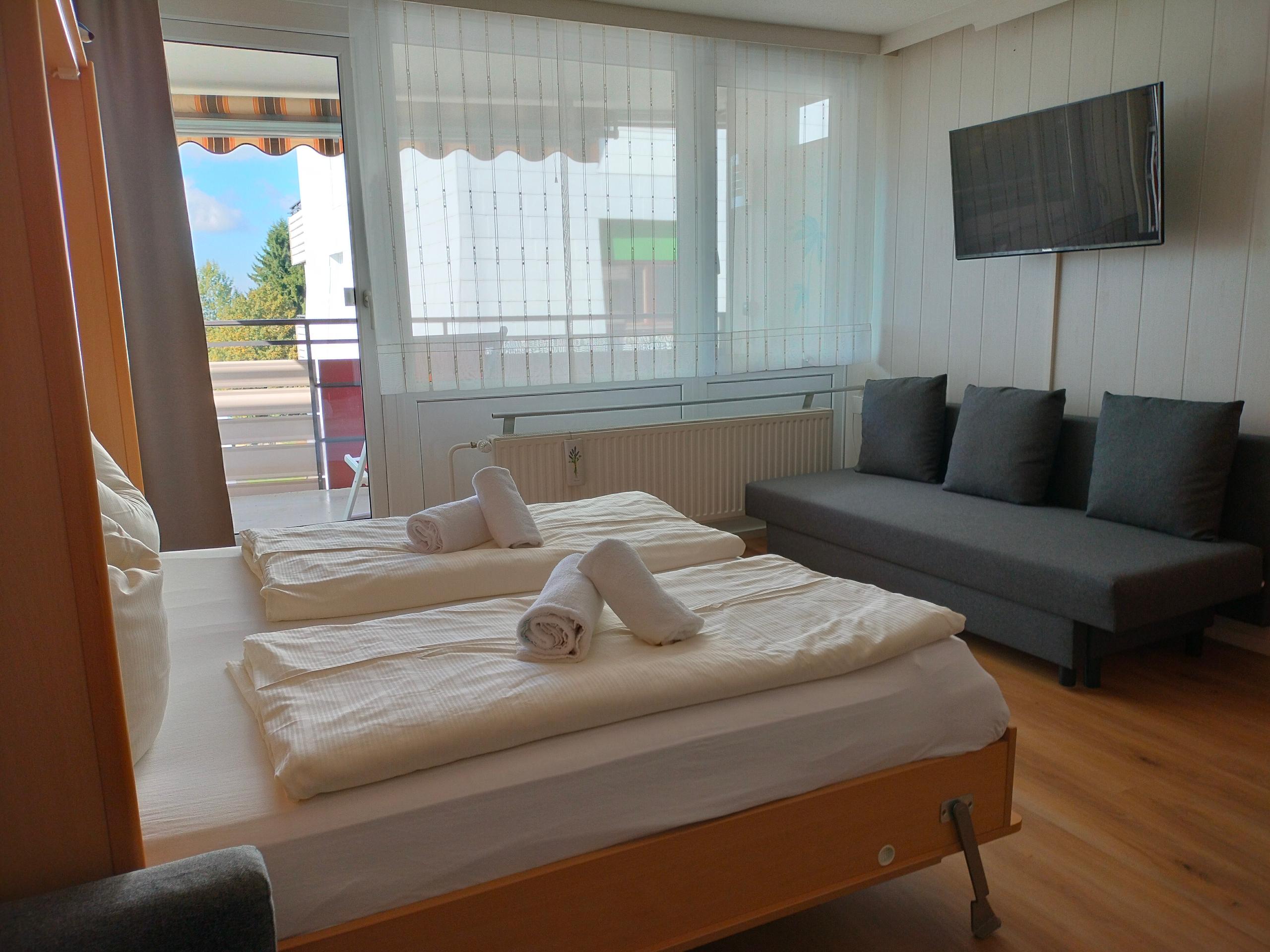 Die Belegung kann bis 5 Personen - bis 4 Erwachsene oder 4 Personen plus Kleinkind im Babybett - erfolgen. Auch bei ausgeklapptem Schrankbett (Doppelbett) und ausgeklappter Couch (kleineres Doppelbett) steht noch Platz für ein Babybett (kostenlos, mit Matratze, aber ohne Bettwäsche) zur Verfügung.